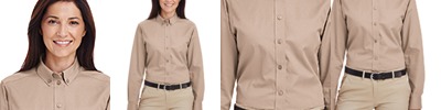 3.9 oz./yd² / 132 gsm, 60% cotton, 40% polyester dobby with wrinkle-free and stain-release performance; Stain-release and true non-iron performance straight from the dryer; Active fit; Patent pucker-free taped seams; Specially fused collar, cuffs and placket for total garment performance; Straight collar with built-in collar stays; Princess seams in front and back for a feminine fit; Fine yarn-count shirting with pealized buttons; Adjustable cuffs with button placket;
