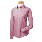 3.4 oz., 55% easy-care cotton, 45% polyester blend. Wrinkle- and stain-resistant fabric. Patented pucker-free taped seams. Specially fused collar, cuffs and placket for total garment performance. Princess seams in front and back and bust darts for a feminine fit. Spread collar. Pearlized buttons.