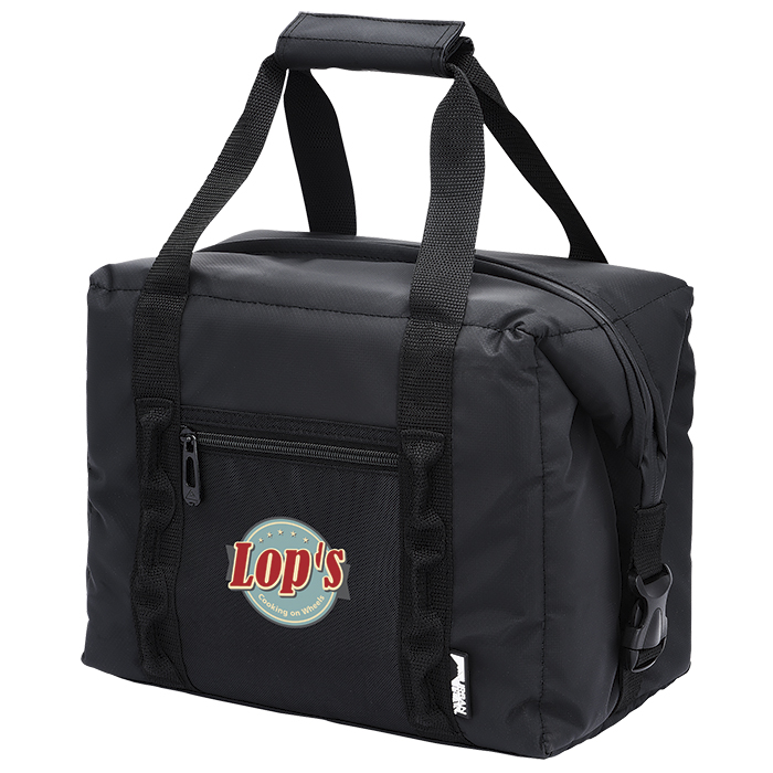 Features a main zippered compartment, front zippered pocket, hook and loop padded handle grip, Constructed from Waterproof 500D Tarpaulin and extra thick double foam insulation, Exterior includes 2 side compression straps, Includes a Stainless Steel bottle opener secured with elastic loop, 1-Year Limited Warranty.  7" D x 12" W x 10" H