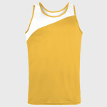 100% polyester wicking knit * Wicks moisture away from the body * Tagless label * Self-fabric binding at neck and armholes * Contrast color front inserts * Double-needle hemmed bottom