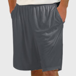 100% Microdenier Polyester. Moisture wicking plus anti-microbial fabric. Disperses and wicks moisture away from the body for quicker evaporation. Full cut short with 7" inseam. Premium 2" covered elastic with inside pull drawcord. Two deep inset side pockets. Two-needle hemmed leg openings.