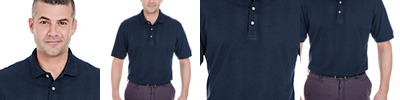 6 oz., 100% preshrunk cotton pique; Heather Grey: 90% cotton, 10% polyester; Relaxed fit; Taped neck and side vents; Half-moon patch; Wood-tone buttons;